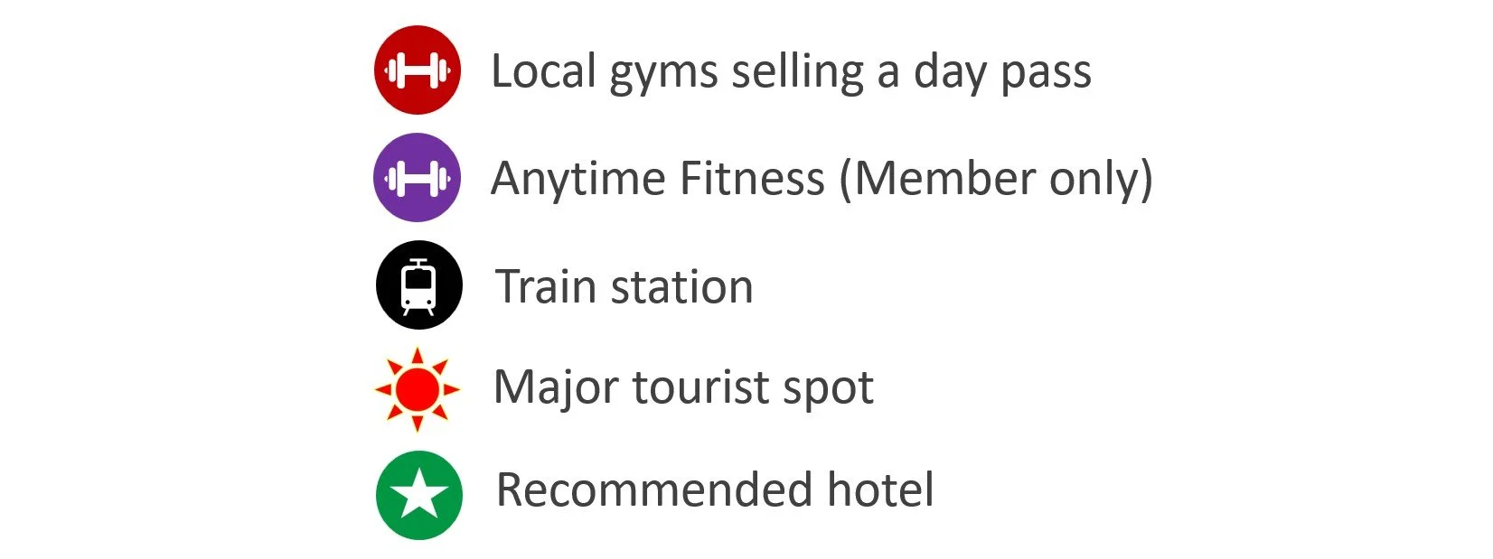 If you are an Anytime Fitness Member in your home country, you can use 1100+ Anytime Fitness gyms in Japan 24/7 for free (your home country’s membership covers the cost). You can use the same security key tag to enter. Often Anytime Fitness gyms in Japan are hard to find as they are located in the back street or on the 2nd floor of big buildings. In this area, there are 6 gyms in convenient locations as follows (Purple icons on the map).